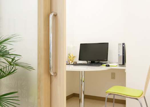 よこやま歯科では、患者さまのお悩みにゆっくり耳を傾けることができるよう、院内に個室カウンセリングルームを設置。さらに一部の診療台を個室に設置することで、患者さまにリラックスして治療を受けていただくことができるよう配慮いたしました。
